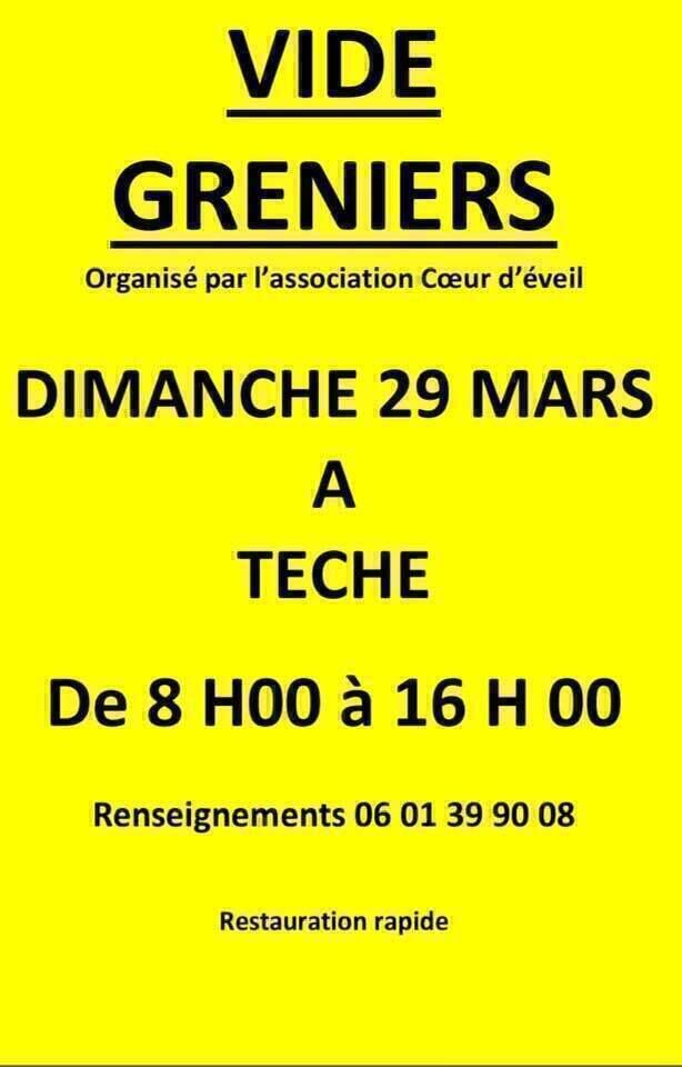 Vide greniers Prochaine date : dim. 29 mars 2026 Voir toutes les dates Localiser : 38470 Têche Présentation Vide greniers organisé par l'association Cœur d'éveil, avec restauration rapide sur place. Contact 0601399008 Périodes d'ouverture Dimanche 29 mars 2026 de 8h à 16h. Tarif Accès libre. Localisation Calculer votre itinéraire 38470 Têche